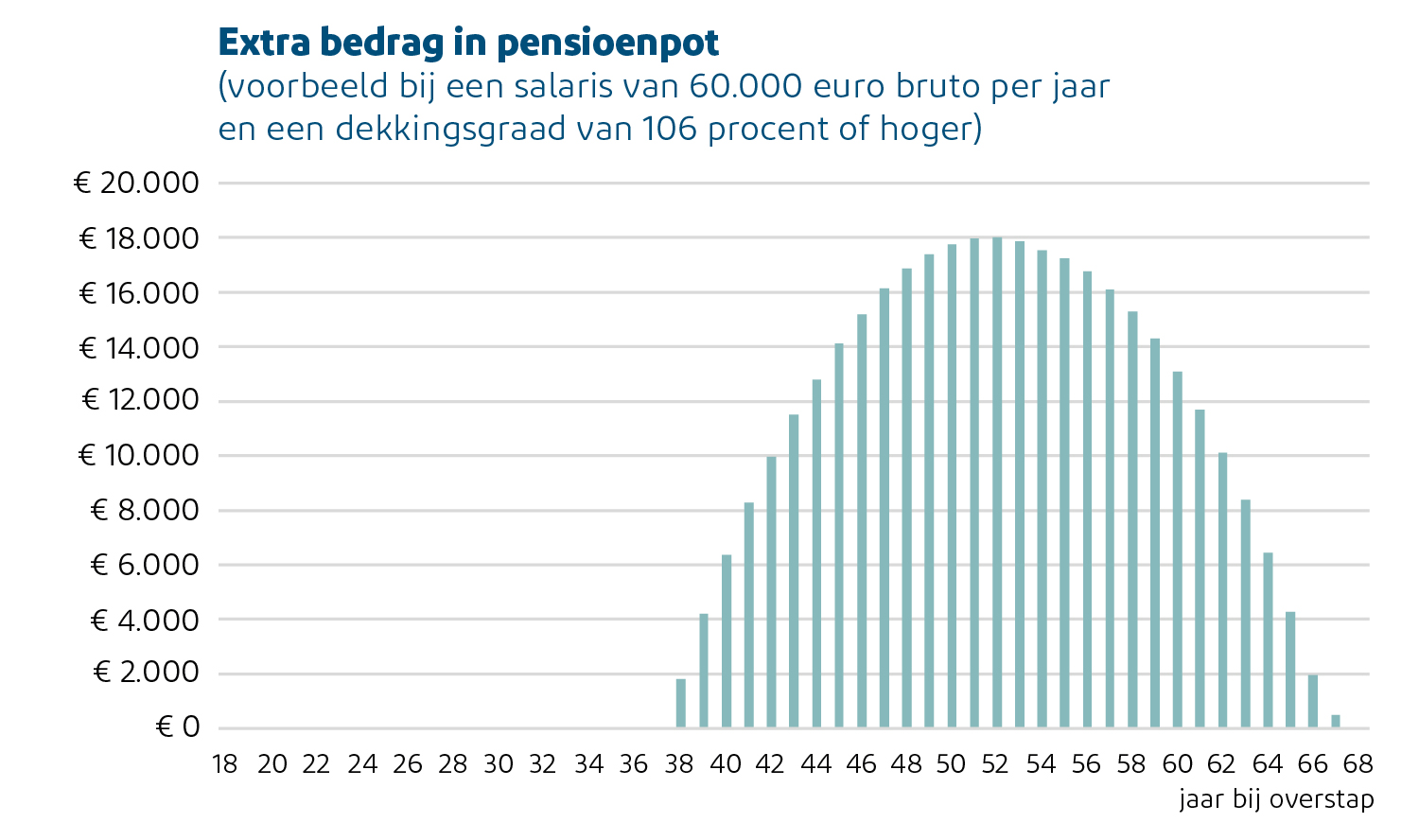 Dat hangt af van verschillende dingen. Bijvoorbeeld je leeftijd en je salaris op het moment van de overstap. Maar ook van onze financiële gezondheid op dat moment. In het plaatje hierboven zie je welk bedrag je ongeveer kunt verwachten als je een salaris hebt van 60.000 euro bruto per jaar. En als onze financiële gezondheid bij de overstap goed genoeg is voor volledige compensatie. Je krijgt dit extra bedrag één keer in je pensioenpot. Uit je pensioenpot krijg je later de rest van je leven pensioen.