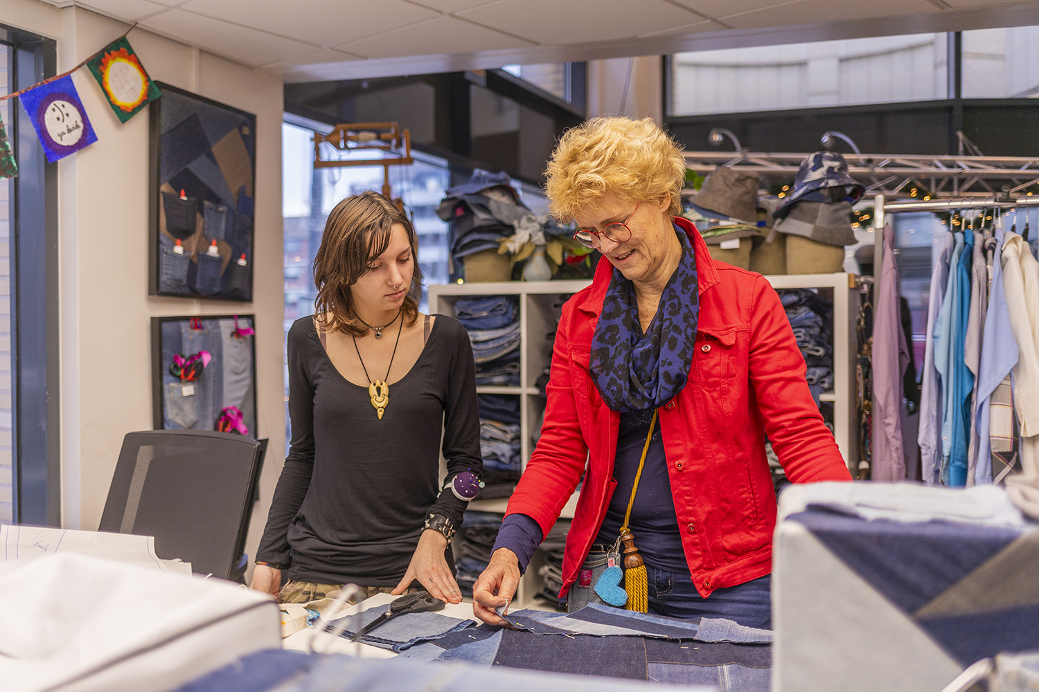 Iedereen is welkom bij ons. Wij helpen ze om weer richting te geven aan hun leven. Dat doen we onder andere via ons naaiatelier. Daar kunnen ze meewerken aan naaiprojecten, die we vervolgens in de winkel verkopen. We hebben ook stagiairs. Dat zijn leerlingen van modeopleidingen in Eindhoven, Tilburg en Den Bosch. De jongeren helpen elkaar en ik loop ertussen als begeleider.